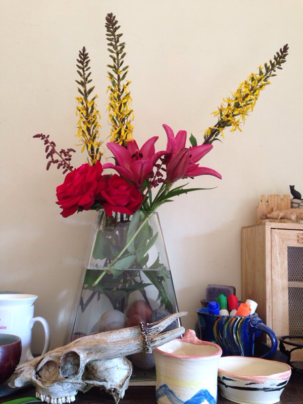 院子里繁花似锦了。 摆一瓶。动物头盖骨是我外甥女从林子里捡回来的。9岁小丫胆子忒大,看见了毫不犹豫捡起来,屁颠颠拿来给我,当时吓得咱一哆嗦。前些天收拾院子看到小木屋的角落里,拿出来看看。其实挺美。 ?杯子和小碗是老二手工。家里许多这样无处安放的纪念品,不知道咋整。