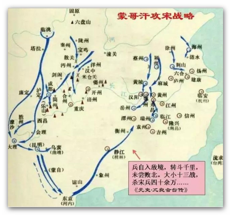 1258年秋,蒙哥(他是蒙古帝国最主要的疆域扩张者和屠杀者,死后谥号桓肃皇帝,即元宪宗)率约十余万人马分三路进攻四川作为战略主攻方向,意欲发挥蒙古骑兵长于陆地野战而短于水战的特点,以主力夺取四川;然后顺江东下,与诸路会师,直捣南宋首都临安(今杭州)。蒙军相继占据剑门苦竹隘、长宁山城、蓬州运山城、阆州大获城、广安大良城等,沿途那些守城的宋军要么闻风逃跑,要么开城投降。1259年1月底,大军迫近合州(今合川钓鱼城),在这里蒙哥撞上了他的末日。