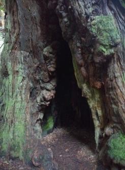 国家公园在一个山坳里,山坳也就几百米的宽度。中间有一条小溪,流水淙淙,清澈见底。山坡上和小溪畔,长满了高大的红杉树,遮天蔽日,一片阴暗。加之林中横七竖八地躺着许多枯败腐朽的树干,一如尚未打扫的战场。我目睹过很多原始森林,都是这种情况,森林愈古老,林间腐败气愈重。不知道是雨后还是林中总是如此,空气湿漉漉的,简直能拧出水来。我们沿着湿润但不泥泞的林间小道往深处行走,满目都是令人惊叹不止的红杉树。有的是一片林子,数不清的粗硕挺拔的树干直耸云霄,疏朗壮观,观之令人顿生大气度;而那些五人拥抱也难合围的树王,却孤单地矗立在路旁。见此景象,我不由得想到人类社会,人的地位越高,越远离人群,孤独离索;国家存在时间越长,腐败气愈重。难不成树也和人一样?成为树王之后也就离群独处,高傲漠然,森林年代久远,倒下腐朽的树木愈多!
