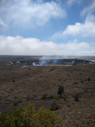 我们到达火山口的时候,天气还算能讲得过去,但不一会儿,一团乌云就压过来,遮没了整个山顶,五十米外不见物体。天公虽不算作美,但也没完全让人扫兴,留给我们十几分钟时间,让我们看到了火山口的全貌,同时也看到了冒纳罗亚孤独的盾状山体。在乌云完全遮住了视线后,于是就匆匆进入火山博物馆浏览。展馆里有一个大厅,不停地循环播放夏威夷群岛的成因和火山喷发时的瑰丽画面,由于时间关系我们不能多看。这日恰好赶上火山纪念馆100周年,买了两件带帽子的印字绒衣做纪念。之后,我们去看地热口,也是雾蒙蒙一片,什么都看不见,紧接着又是风雨交加,雨伞根本遮挡不住风雨的侵袭,只好钻进汽车,去绿沙滩了。