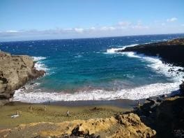 大岛南部的旅游亮点是三色沙滩——绿色、白色和黑色。绿色主要来自于橄榄石的碎渣,白色主要来自于大量贝类和珊瑚的碎屑,而黑色是由熔岩大量涌入海水时冷却形成的。绿沙滩,顾名思义,沙滩是绿色的。它是夏威夷大岛著名的景点,值得一行。它距离美国领土最南端的尖角5千米左右。