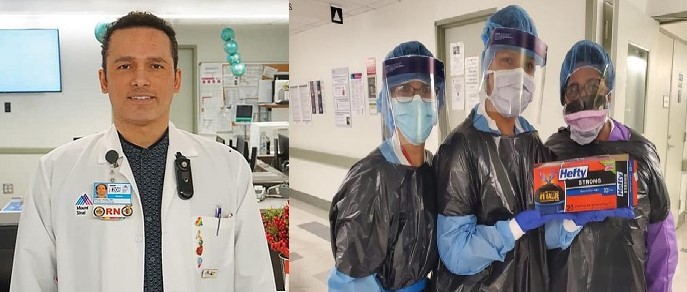 图2 这是纽约殉职护士Kious Kelly。右图是他与同事们在疫情期间穿着垃圾袋工作的照片,曾被全世界各大媒体刊登。他死后,他的亲友们曾呼吁全社会捐赠医用防护设备。在微信上,很多人用他的故事做例子,声称美国医院缺乏基本的防护设备。后来,他所在的医院官方澄清,这张照片中的三个护士都穿戴着医院提供的全套防护设备,医院里也没有出现过医护人员没有防护服可穿的情况。Kelly生前有严重的哮喘病,而新冠病毒对哮喘病人的危害极大。他的死疑似与他的哮喘有关。