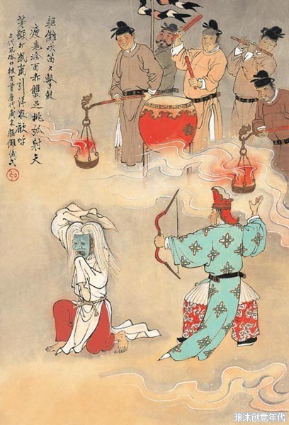 东 汉应劭《风俗通》中引《黄帝书》云:上古有神荼郁垒二兄弟,居度朔山。山有一桃树,树荫如盖。每天他们在这树下检阅百鬼。如有恶鬼为害人间,便缚之喂虎。 故家家户户于春节户悬『桃符』。到了唐代,门神的位置便被秦叔宝和尉迟敬德所取代。《西游记》中便有唐王作恶梦,要秦琼、尉迟恭守宫门的故事。