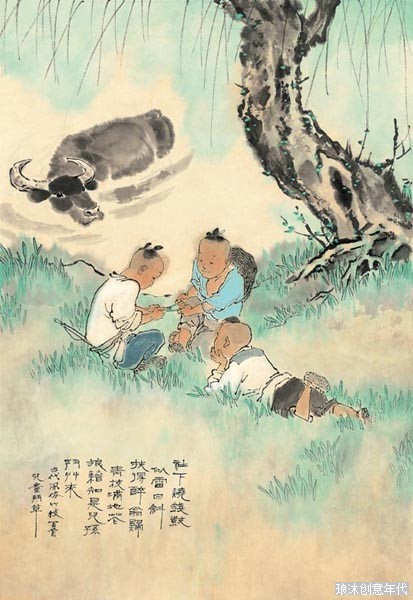范成大《四时田园杂兴》中“春日杂兴”曾描述儿童斗草情形。见画中题诗。盖江南春早,立春草长,儿童互相用草角力,坚韧者胜,折断者败。
