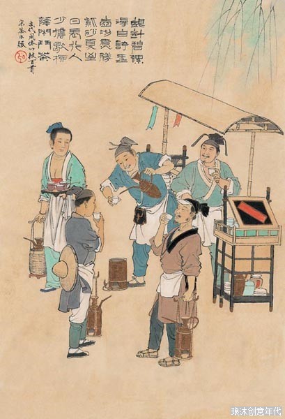陆羽《茶经》引晋代《广陵耆老传》云:“有老妪每旦独提一器茗,往市鬻之.市人竞买,自旦至夕,其茗不减。”所谓茗,即茶水;这老妪是最早的茶水小贩形象.后来虽发展有茶棚,茶馆,茶楼,而小茶贩仍然存在。范祖述《杭俗遗风》:『杭州有茶司一行,最为便当。