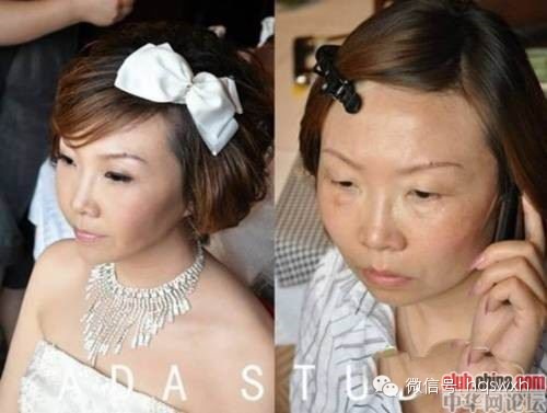 近代中国女子的婚姻,大多还是以相亲为“爱情”的开始,只是不像古人那样连要嫁的人还没看清就稀里糊涂的被放在了人家的床上。和古人相比她们是“幸运”的,至少还能有机会看清自己未来男人的脸不是。她们也可以尽情的把自己打扮得漂漂亮亮的,只要她们有钱买得起洋胰子,扑粉,花露水,胭脂粉和口红,不用像古人那样将白铅化成糊状的面脂,吸干水分,碾成粉末或做成固体的形状,使用的时候就涂成个大白脸;也不用把柳枝烧焦涂在眉毛上,更不用把花朵捣碎和着油脂当腮红用。。。但是,不论怎样,她们的妆扮是自然的,是锦上添花式的,是可识的“庐山真面目”。有回忆文章记载,老蒋夫人宋美龄女士一生都是以妆容示人,从没人看见卸过妆的她的真面容。个人觉得说这话的人多少有些“言过其词”,随便找一张蒋夫人的照片,大致都可看出她本人的真实模样,也可以清楚的看出她是精心的瞄过眉眼,涂过唇膏,打过粉底的,那就是她,是一个用心化了妆,把自己最美丽的一面示人的真实的女人,而不是一个被妆裹得面目全非的“妆中美人”。