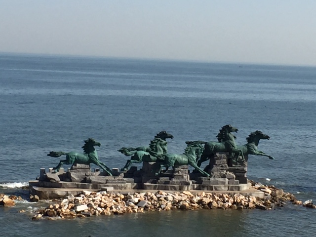 屹立在海水中的青铜奔马雕塑。
