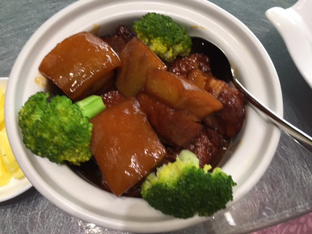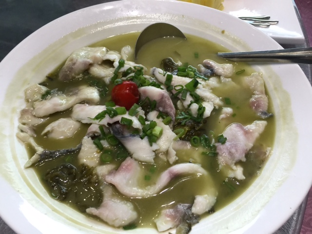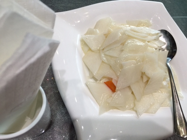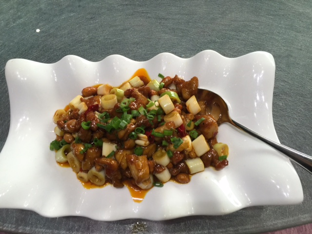 这个菜很有意思,好像叫豆腐城?端上桌的就是一块四四方方刚磨好的新鲜豆腐(可能上锅蒸过),随豆腐一起上来的是三种调料,一种是蒜汁的,一种是辣椒汁的,还有一种好像是腌韭菜花的,朴实无华,豆香十足。