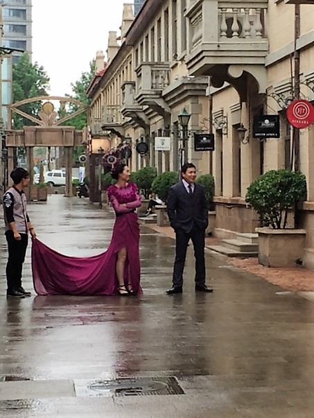 正走着,忽见前方不远处有摄影师在为一对新人拍照,我们立即驻足等候,怕影响了人家的情绪。那新娘看见有人从对面过来,满脸的不高兴(那有什么办法?这条街又不是你家的。)还特意问摄影师:“你不是说这条街都被你包了吗?怎么还有人走呢?”看起来,那摄影师没跟她说实话。想想也是,摄影师要是包那条街得花多少钱呀,不值当的。估计要是能有十对新婚夫妇找他同时拍外景他也许还能考虑考虑吧?看见那新娘所穿的婚礼裙的裙摆都是沉甸甸湿漉漉的一片,感觉这婚结的也太不容易了。