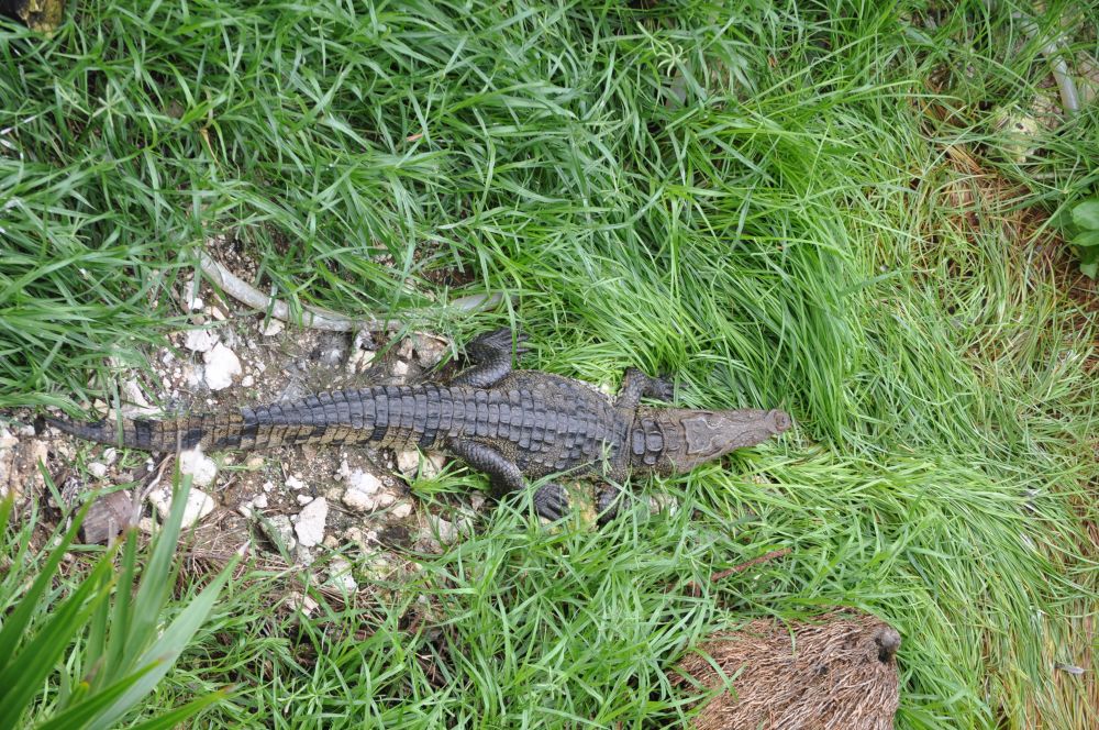 村里有两个鳄鱼池。鳄鱼每周喂一次。喂食的时候,两个工作人员拎着一桶鸡肉进到鳄鱼池,用一个头上带钩的棍子把鸡肉送到鳄鱼嘴边。鳄鱼吃饱了之后,就去消食了,基本上不大动了。