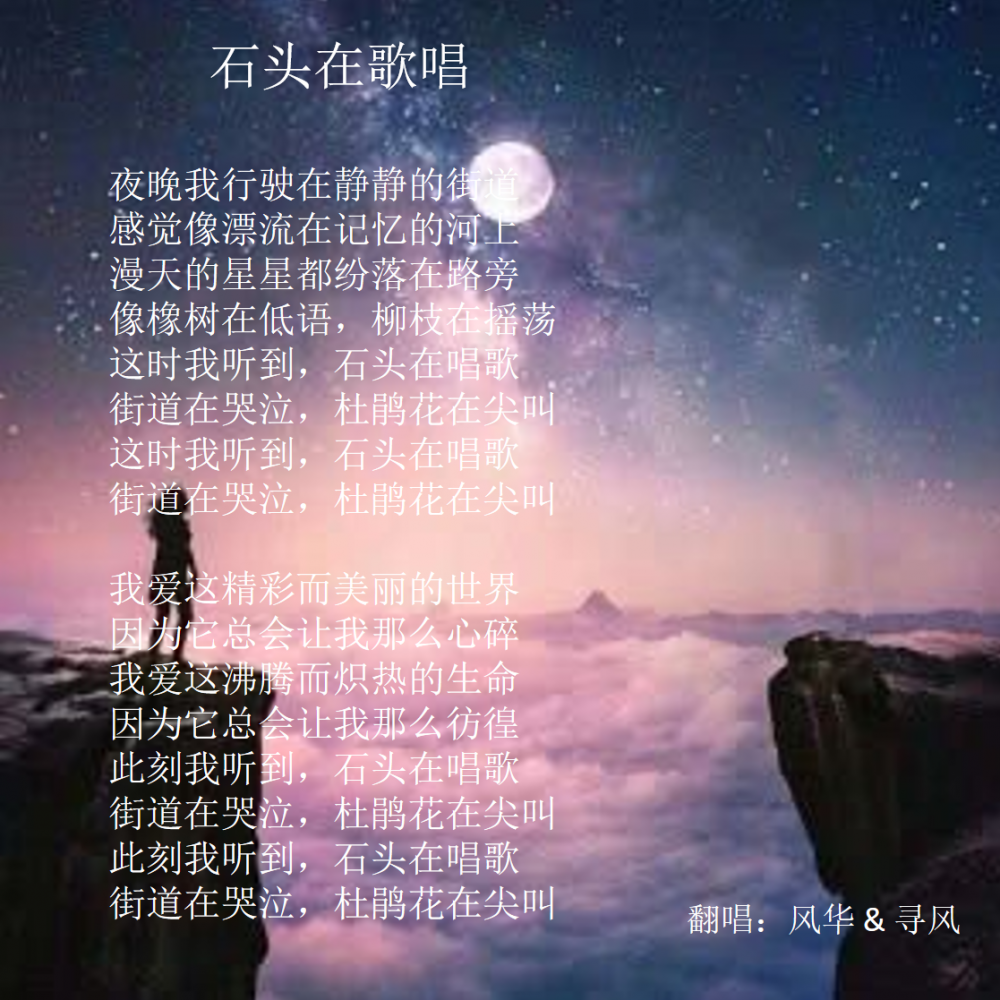 这首石头在唱歌是去年看宝藏歌手听到的,是汪峰作词作曲,收录在谭维维2010年发行的专辑《谭某某》中,又去听了谭维维和汪峰的版本,还是更喜欢宝藏歌手版,没有原版那么长但编曲更精致一些,而且有和声有轮唱,丰富好听。去年就在我的to do list上,一直拖到现在才录,谢谢帅呆的美唱和后期!