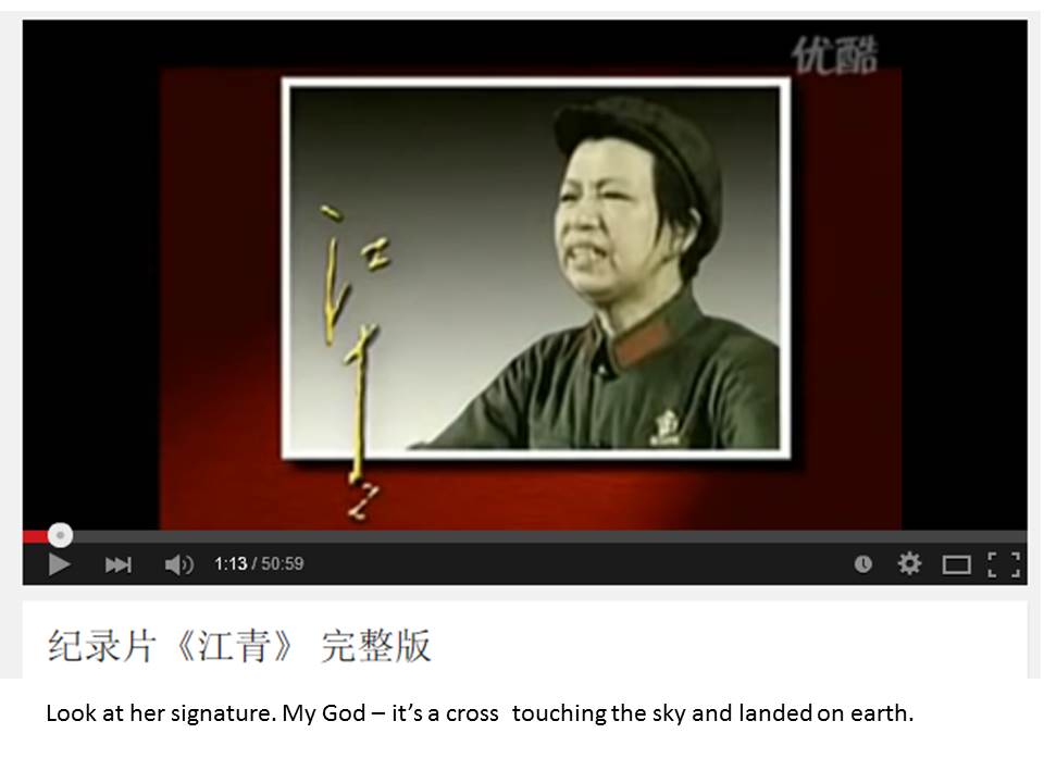 看看江青的签名:上帝的十字架结构 - 这是一个上触摸天堂,下接在地球上的十字架。
