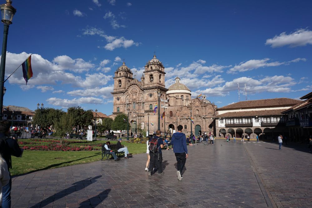 库斯科的老街和街边的房屋,尤其是房屋的木制阳台,都具有早期西班牙殖民地建筑的风格和特点。其中有些建筑和西藏地区的房屋很相像。市中心的拉莫斯广场 (Plaza de Armas)具有典型的西班牙殖民地的特点,Plaza de Armas是广场的一个通常的名称,相当于阅兵场,几乎所有中南美洲各国的主要城市都有拉莫斯广场。广场周边建于1668年的耶稣会教堂 (Church of the Society of Jesus) 和历时95年于1654年完工的库斯科圣母大教堂 (Cathedral Basilica of the Assumption of the Virgin) 是秘鲁及南美洲著名的天主教堂之一。站在强烈阳光照耀下的教堂门前,脑海里很自然地浮现起一首近来流行的歌曲中的两句歌词:大昭寺门前铺满阳光,打一壶甜茶我们聊着过往。