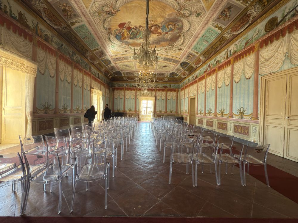 宫殿内部设有多个奢华大厅、私人图书馆、舞厅和贵族私宅房间。最有名的是镜厅(Sala degli Specchi),拥有金色饰面和大量镜面装饰,用于宴会和舞会。还有一个保存完好的18世纪私人图书馆,藏有不少珍贵典籍。