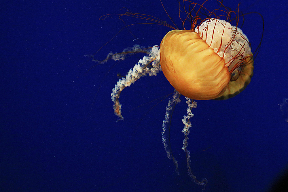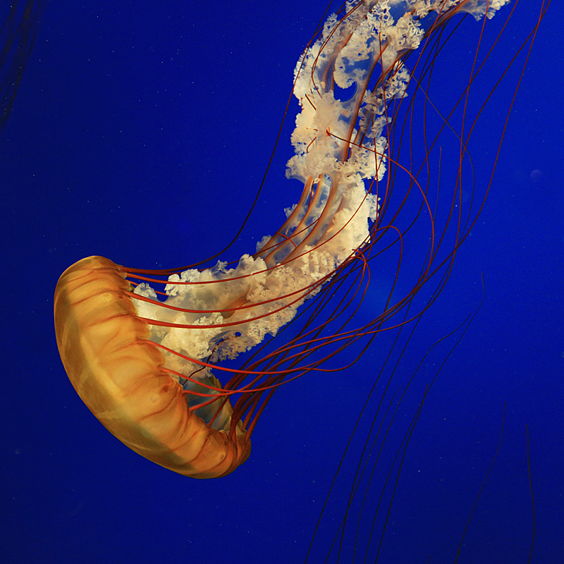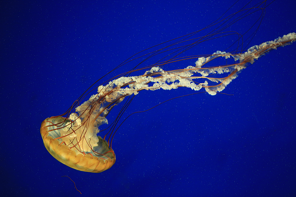 水母身体的主要成分是水,并由内外两胚层所组成,两层间有一个很厚的中胶层,不但透明,而且有漂浮作用。它们在运动时,利用体内喷水反射前进,远远望去,就像一顶顶圆伞在水中迅速漂游;有些水母的伞状体还带有各色花纹,在蓝色的海洋里,这些游动着的色彩各异的水母显得十分美丽。