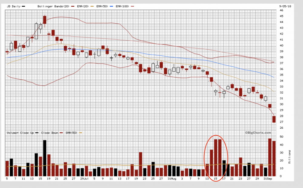 空头应该是从13日到16日开始的,13日开始突然爆量,14日起每天超过平均4千万股的交易量。平时JD的每天交易量最多只有1千万左右。突然爆量那么多,特别是没有任何负面消息的情况下。