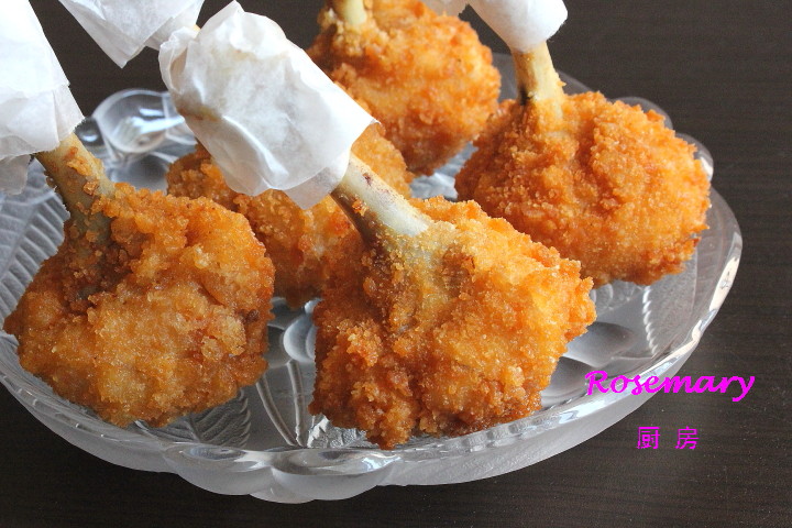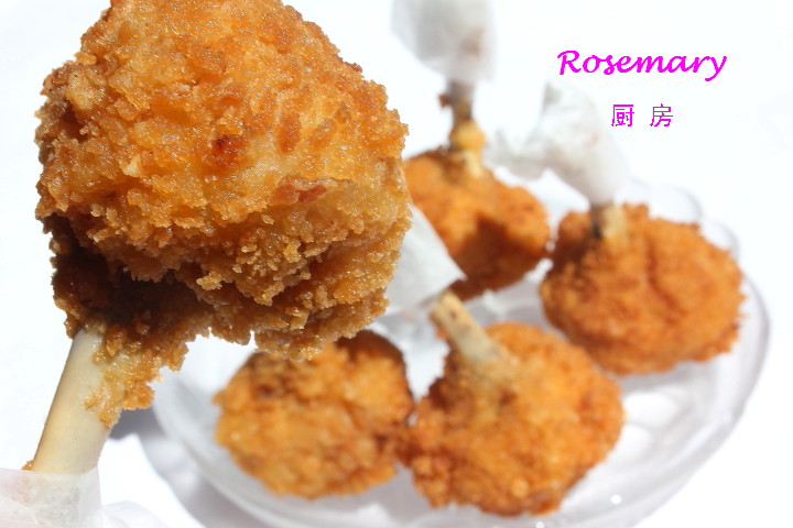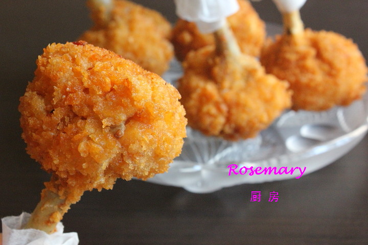 裹了面包糠的鸡棒槌下入油锅中,先中小火炸熟,再大火迅速复炸一遍使成金黄色