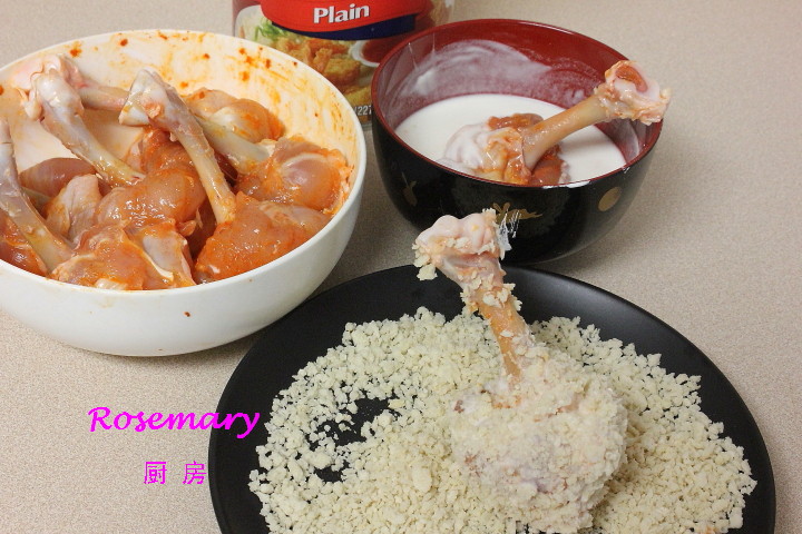腌好的鸡棒槌在粘稠的水淀粉中蘸一下,然后再在面包糠里打个滚,使其全身均匀地沾满面包糠