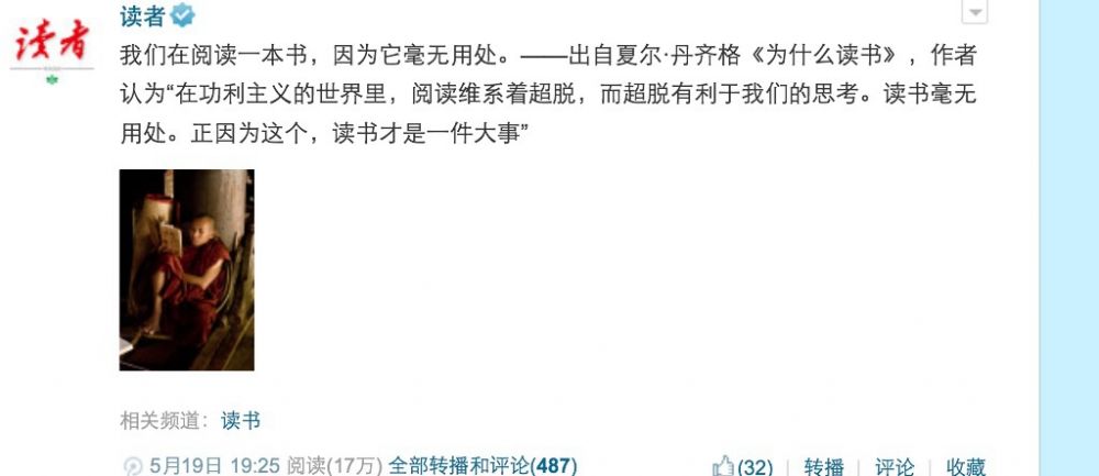 碰巧在《读者》的微博看到这段话,觉得很有智慧。 我们为什么要读书?