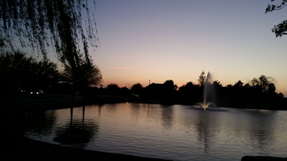 晚饭后, 出去散步, 因为关节有点疼, 走了一会, 就在池塘边的长椅上坐了下来, 先生去跑步。戴上耳机听歌, 观赏着池塘里的喷泉不停的喷洒着水流, 夕阳下的浅紫到夜幕下的淡白。天空由碧蓝而墨蓝, 月亮高挂在沉沉的夜空。