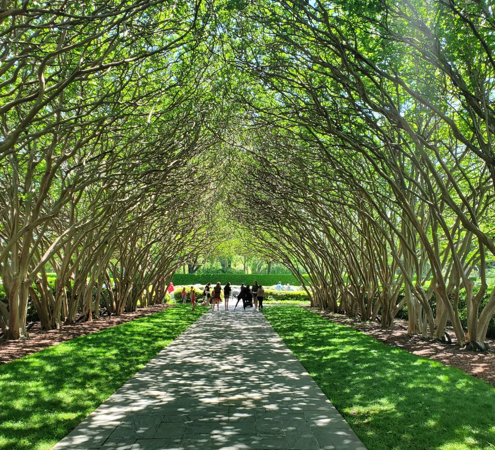 最后,走进植物园最富盛名、具有标识性的紫薇花道(Crape Myrtle Allee)。一条笔直的小路通向远方,两边是绿色的草坪,然后是成行的紫薇花树。花树枝条向中间弯曲生长,在天空形成一道天然屏障,遮天蔽日。阳光透过树叶在小径上洒下点点波光,如梦如幻。