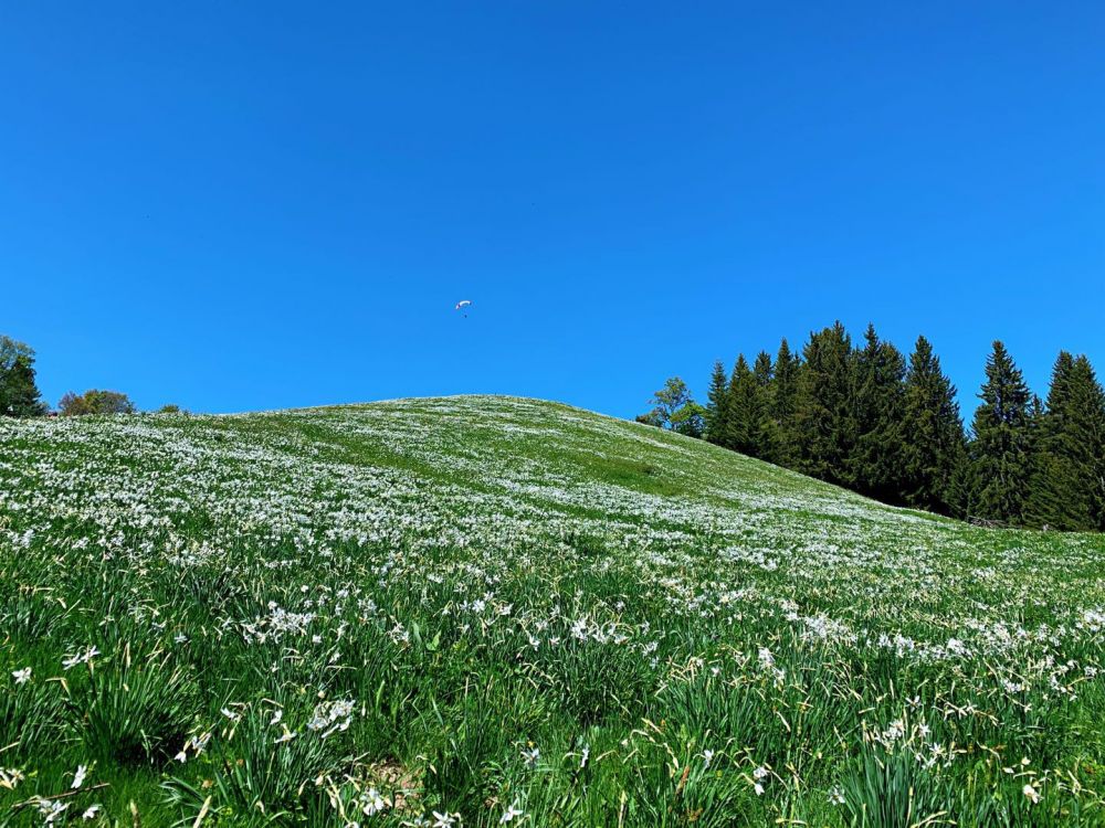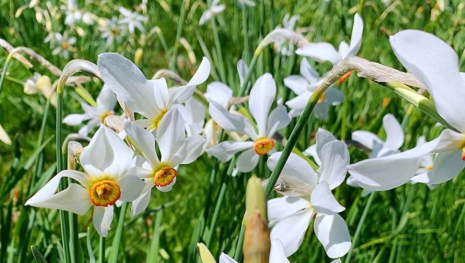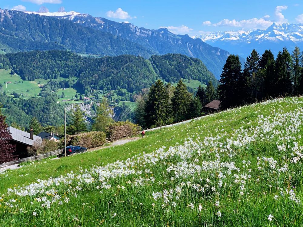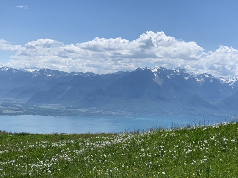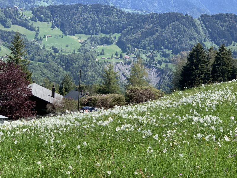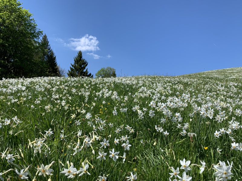 早就听说每一年五月中旬的时候,一种挺拔清雅的山地水仙花会在瑞士西南部蒙特勒附近的前阿尔卑斯山脉的高山地区悄然绽放, 连成一片色泽如雪的白色花海,犹如一片初夏的雪域。据说这种开放在蒙特勒(Montreux)高地山区的山地水仙花叫作红口水仙花,是一种原产于法国至希腊附近地区的多年生草本植物,开放的时间不太长,错过了就看不到了。