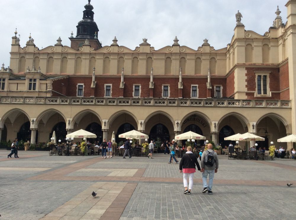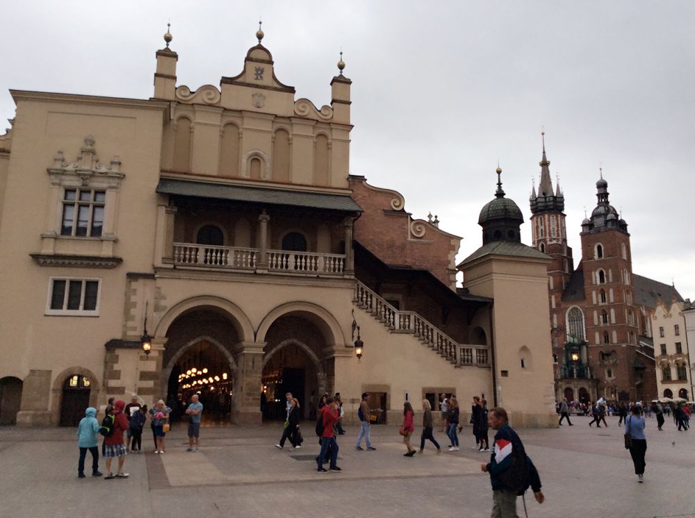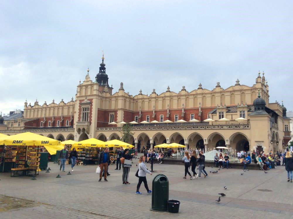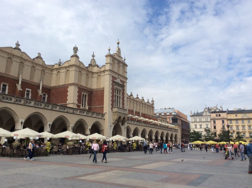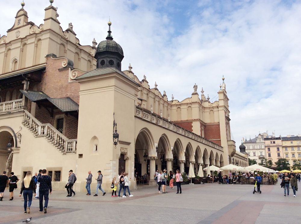 克拉科夫的中央广场是欧洲第三大广场。正对的建筑是著名的纺织会馆,现在有人称之为卖布堂。文艺复兴时期的建筑,当时欧洲最重要的国际贸易中心,来自东方的香料、皮革等物品和克拉科夫及欧洲生产的纺织品、铅和盐进行交易。现在这里的一层仍是市场,但卖的是旅游纪念品。
