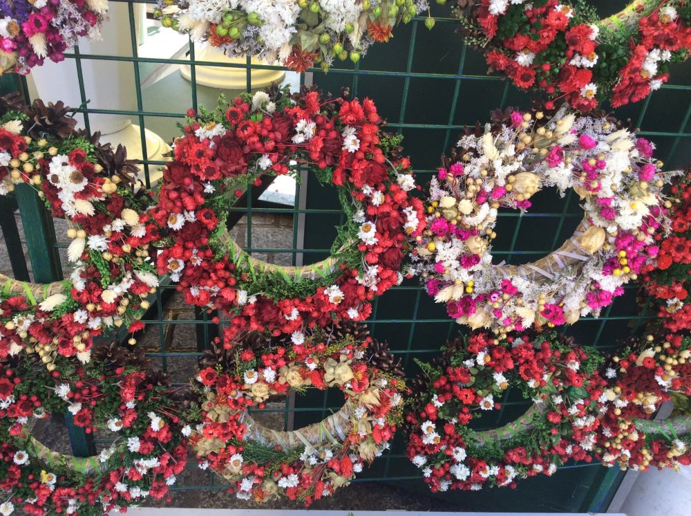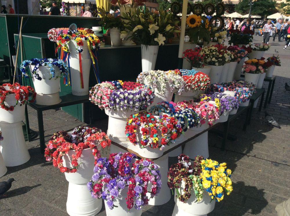 广场上有许多卖鲜花的摊,很多漂亮的花环,有的是鲜花有的不是,都非常漂亮。