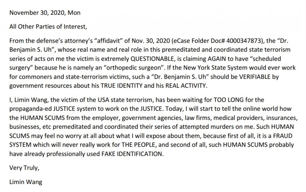 of "Dr. Benjamin S. Uh" AGAIN. The following images were from a file what the defense's law firm Jones | Jones LLC has claimed, and my short response to the AGAIN non-availability of "Dr. Benjamin S. Uh". Mr. Lucky Enobakhare, Dr. Benjamin S. Uh" is not my doctor, as you frame in such a way. "Dr. Benjamin S. Uh" is a sham "treating doctor", but a real part of the state-terrorism to function to laundry the REAL MEDICAL EVIDENCES off in sham and shame "medical reports". Not only on FAKE medical diagnosis and treatments, medical providers in places such as New York Medical & Diagnostic Center carried out PROFESSIONAL MURDEROUS ACTS in the disguise of "medical diagnoses" and "medical treatments", FROM THE VERY BEGINNING of their "medical service" on this case. The HUMAN SCUMS NEED TO PAY.