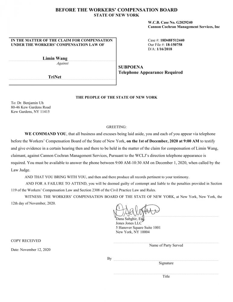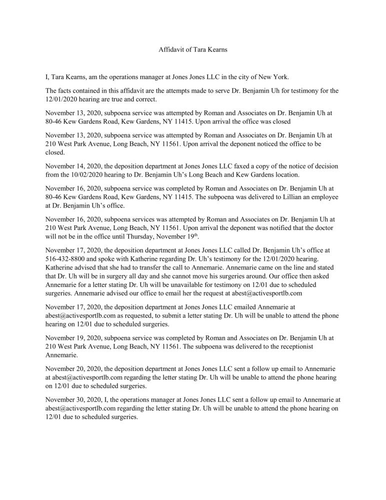 NYS WCB Case# G2029240: "Dr. Benjamin S. Uh" is again on "Surgery", not available for "Hearing"