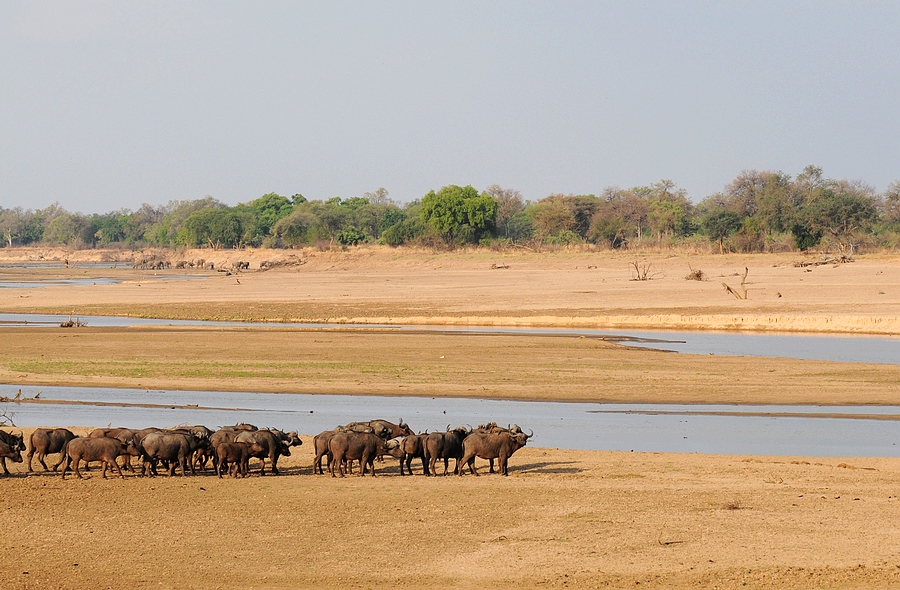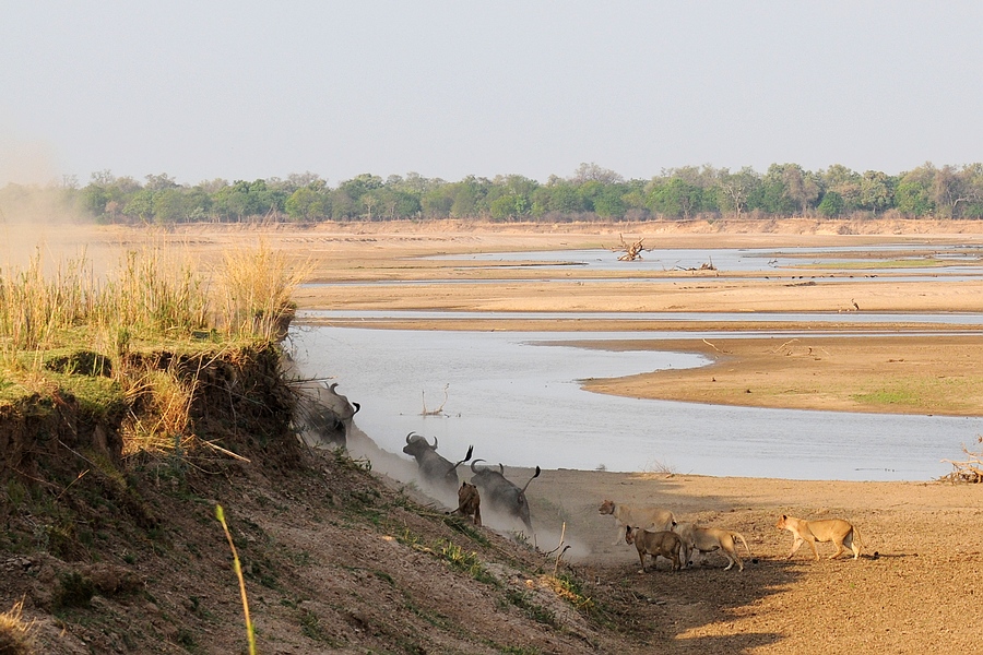 第二天早上我们徒步去现场,野牛的尸体不见了,狮子也不见了。向导说至少野牛角和头骨应该还在,唯一的解释就是尸体被鳄鱼脱到水里。我们走的这条小路就是昨天野牛群下坡的地方,有一个狭窄的”瓶颈“。我们一行人必须走在一起,不然可以拍全。走在第二位的就是赞比亚很有名气的向导-Aubery。后面两位来自意大利。
