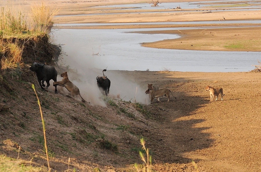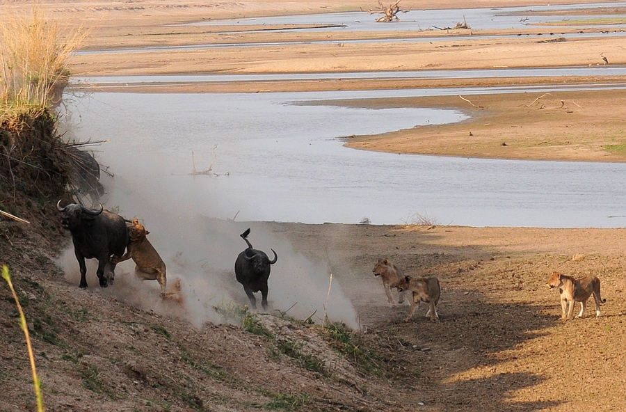 野牛群向高坡撤退,和野牛相比,狮子的奔跑速度并无太大优势(向导后来介绍,如果1对1,狮子通常不是野牛的对手,但是5只狮子在一起就完全不同了, 他们非常懂得团队合作)