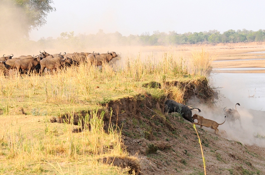 随后,其中一只犯下致命的错误,背离牛群向河边跑去
