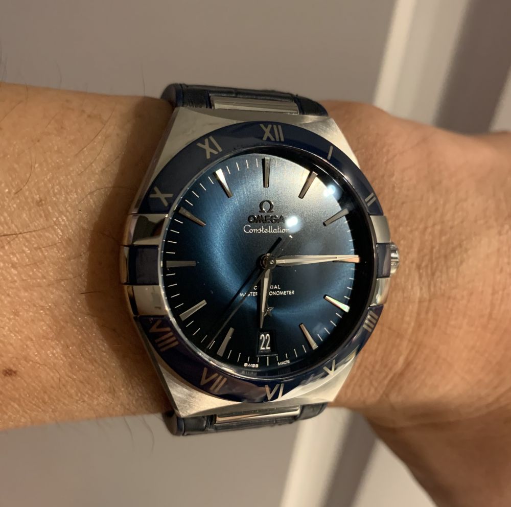 欧米伽星座是欧米伽的代表作。其最突出的特点是表两侧的卡爪,表壳上的月牙切面。两对卡爪使表显得庄重沉稳,半月切面及倒角使表即浪漫又精致。时标为高抛光的条形金属,形状来自纽约的自由塔,切割成不同角度的反光面,不论光线从任何角度照射,时标都熠熠发光。日历一改大多数表的三点位置,设在六点上方,使表的对称性更强。日历上方是一个光芒四射的五角星星。金属表盘密密地刻着放射纹。与众不同的是,放射纹不是以表盘中心为原点,而是以五角星为原点。随着角度不同,放射纹会以五星位中心放散出不同现状的光晕,异常美丽炫目。表圈是世界超级名模辛迪克劳馥所设计,为陶瓷材质,光洁而温润。表圈里边镶嵌的罗马数字为液态金属钛浇铸而成,浑然一体。罗马数字与表盘的自由塔内外呼应,围绕着迁长的夜光针,显得十分和谐,高雅。