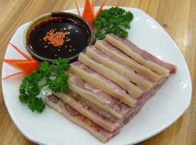 鼎鼎有名的冷菜,看上去晶莹剔透,味道香嫩不腻也叫“水晶肴蹄”,使用精选的猪前蹄肉经过特殊手法加硝腌制后加工而成。香味醇厚,口感细嫩,酥润不腻,咸淡爽口。与镇江锅盖面、镇江香醋并列为“镇江三怪”。