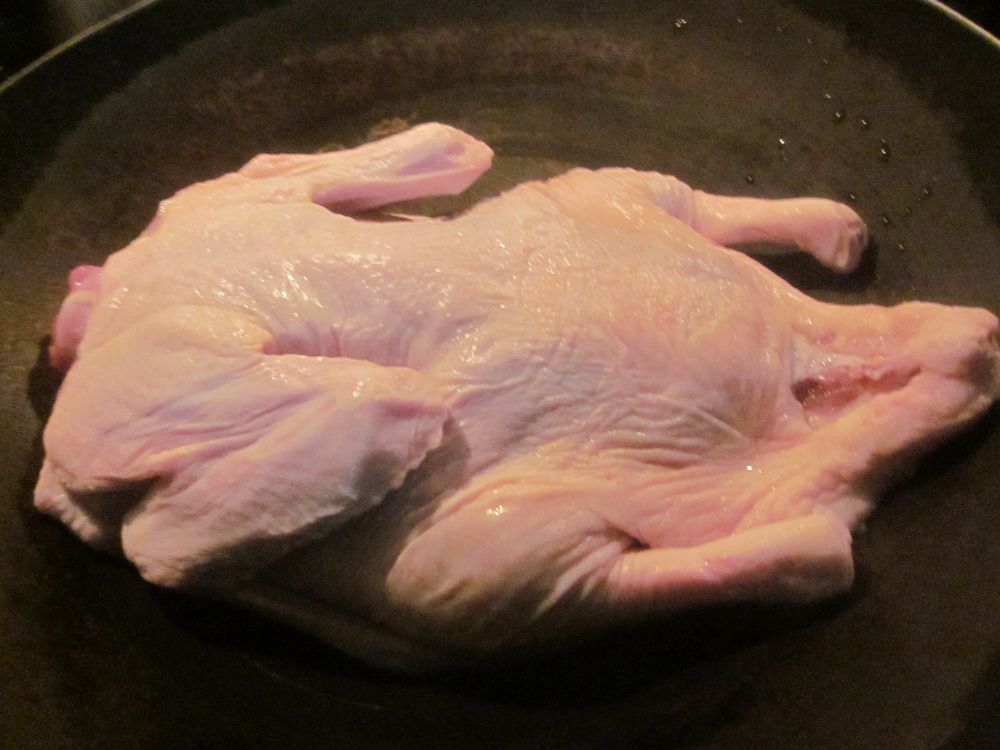将鸭从胸部切开,覆在盆上,盆中放一碗水,鸭上浇上豉油酒糖姜葱当归的酱汁