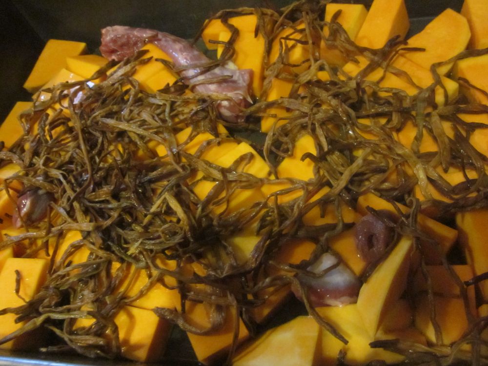 放一些能吸酱的瓜菜如芋头,土豆,木耳,蘑菇,冬瓜等,这次用南瓜