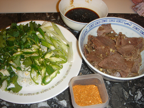 1。基本原料和调料(牛腱肉煮一个小时,切薄片;辣椒面;香菜,一根尖椒切成丝,葱,姜末蒜末装盘,垫底;小碗内用煮牛肉的汤,放酱油,味精,盐)