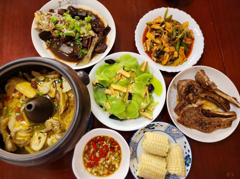 炒牛肉片,红烧肉,清汤苋菜,红烧黄鱼。另外,是我最近学的蘸汁,用酱油,大蒜末,辣椒油,青柠檬汁,花椒油搅和一起。沾鞋底都好吃。
