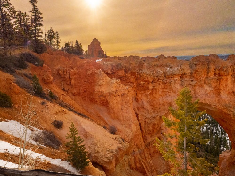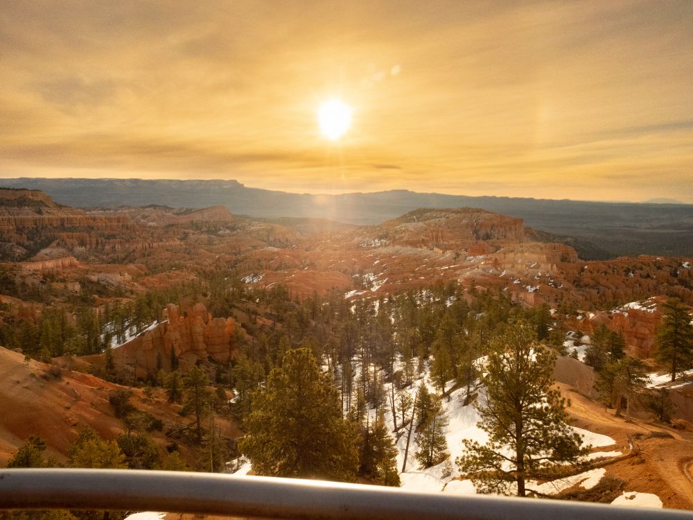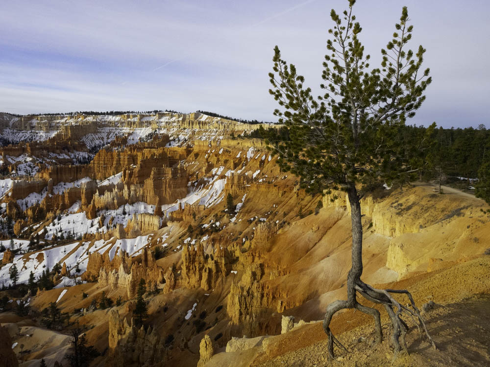 出游客中心,没顾上吃饭,我们首先将车停到sunrise point停车场,停车场不大,估计高峰季节停车困难,最好坐shuttle。从Sunrise point出发,走了一段 Queen’s garden trail,这条步道1.4km, 拔高100m,算是较容易的一条线,其实返回时一路上坡,还是需要体力的!沿着步道纵深进入峡谷,近距离观看红岩石林,美轮美奂,让人叹为观止。忍不住一路照相,1.4km下坡, 走了1.5小时,回时赶时间,只花了半小时。这本来是条环线,但只开了1/3,走到“维多利亚女王像”处就不通了。不过我们也是走马观花类的,步道就留到下次,住上几天慢慢走。上来后,沿rim trail 走到sunset point, 一路风景很美,忍不住往inspiration point走,但只走了一半,开始飘小雪,风也大,感觉温度只有-3度,我们准备也不足,没带干粮,又冷又饿,只好返回停车场,好在这里有个camp store, 什么都有,pizza, pizlze,还有辣汤,这时已是3:30pm, 也许景色真是忘我的美,一根能量棒,维持了7个小时。