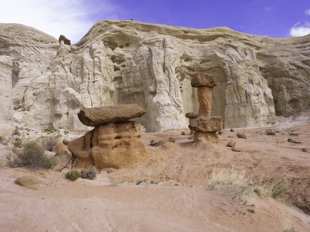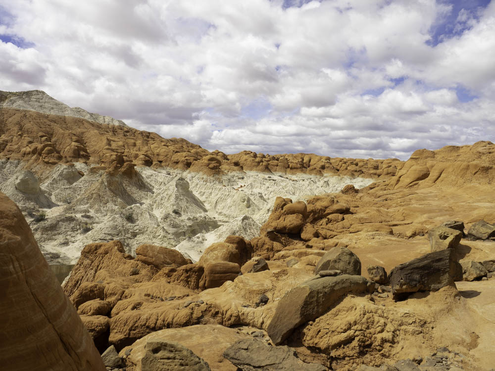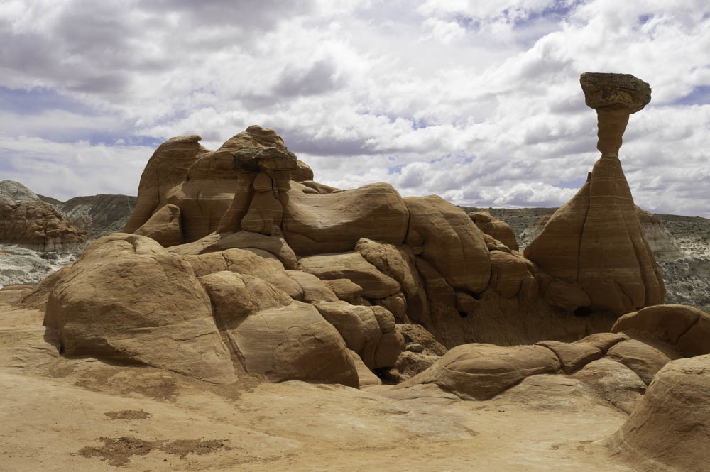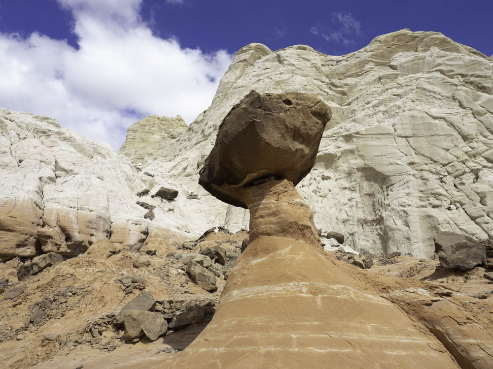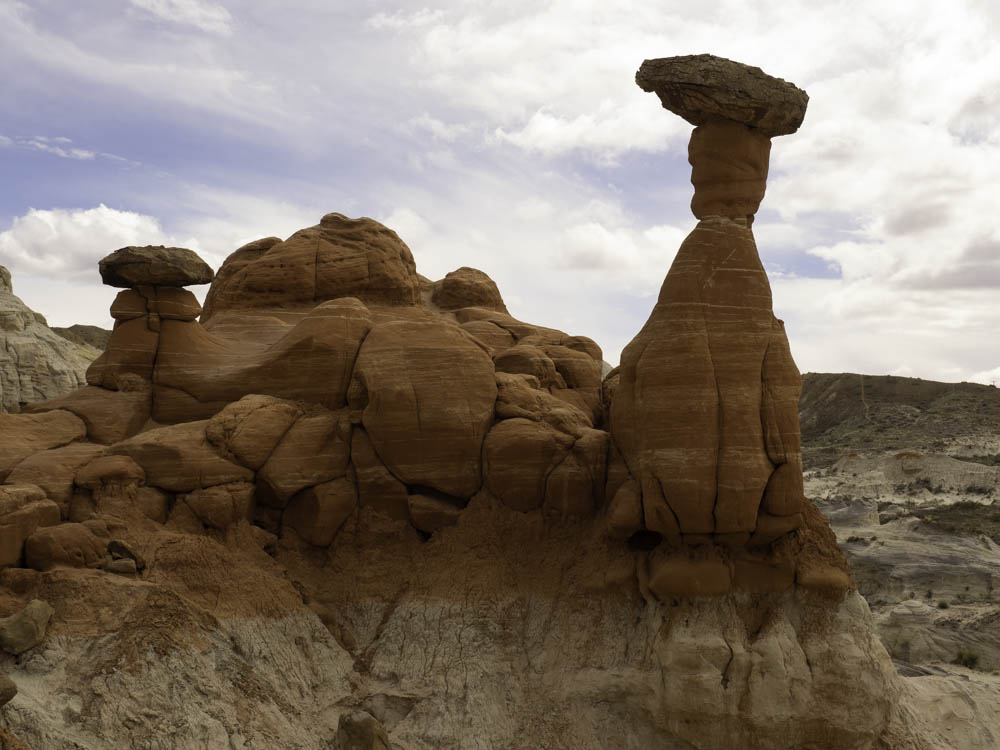 蘑菇岩介绍中的第一句就是:你想去外星球吗?这里的地貌非常奇特,除了红砂岩,还有洁白的石灰岩,不像犹他多见的峰林地貌,而是一些蘑菇状、孤立、分散的石柱。巨大的石块栖息在一根突兀石柱上,记得曾经见过类似照片和介绍,说是以当时的技术不可能将那么重的石头放在石柱上,怀疑有更高文明的外星人来访。其实它们是经过上亿年才形成的:蘑菇岩代表了两个地质年代,下层先形成并不断被风化和腐蚀成为柱状,顶石是后来不断层积而形成在柱顶的;下层松软的砂岩再不断被风化腐蚀,就形成了顶大柱细的蘑菇形态。此外这里如城墙般的白色大台阶(grand staircase),还有一片像是挖掘出来的、表层红岩已被腐蚀,露出一个个如同正在形成中的白色蘑菇岩,身临其中,在叹服大自然的鬼斧神功时,禁不住唏嘘有什么能经得住时间长河的地老天荒、海枯石烂。