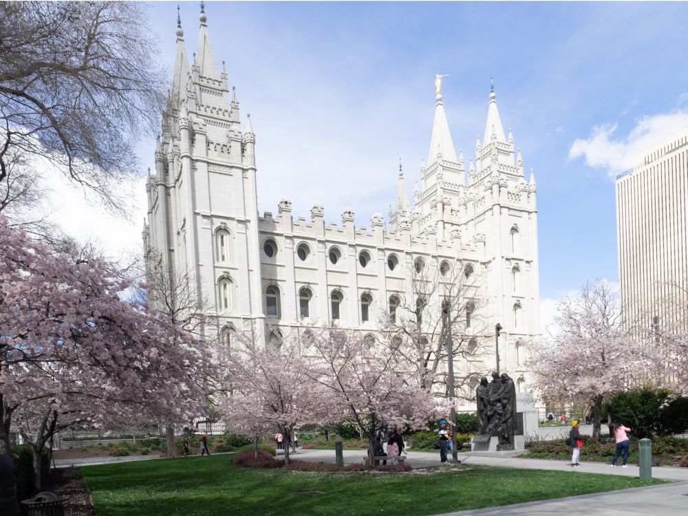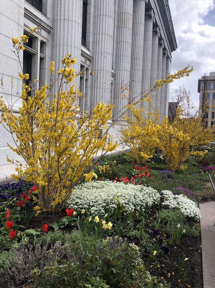 这次时间较紧,原本不打算进盐湖城中心,走时遇见邻居,他们才去了盐湖城,建议我们一定逛逛圣殿广场,说是每周末还有免费的管弦乐音乐会,由摩门教徒演奏,水平很高,音乐会就免了,真没那水平欣赏。不过作为美国西部最大的人文景观就是最早开发西部的盐湖城摩门教徒,圣殿广场是摩门教教堂,盐湖城的地标建筑,它修了40年,是一个融合了哥特和罗马风格的精美建筑;在圣殿广场附近是摩门教会议中心、摩门教办公大楼,俨然像政府机构,可见摩门教在盐湖城地位之重。盐湖城70%的居民是摩门教,且教徒必须将收入的10%捐教会,所以摩门教会是很富有的,这也难怪其建筑都很气派。最有争议的一夫多妻早已废除,只有少数几万人仍然相信那是神的旨意。圣殿广场外的樱花、五颜六色的郁金正在盛放,还有种不知名的小黄花,很像国内的腊梅,也有淡淡的香味。教堂是不能进入的,在四周逛逛,算是到此一游,一个小时绰绰有余。