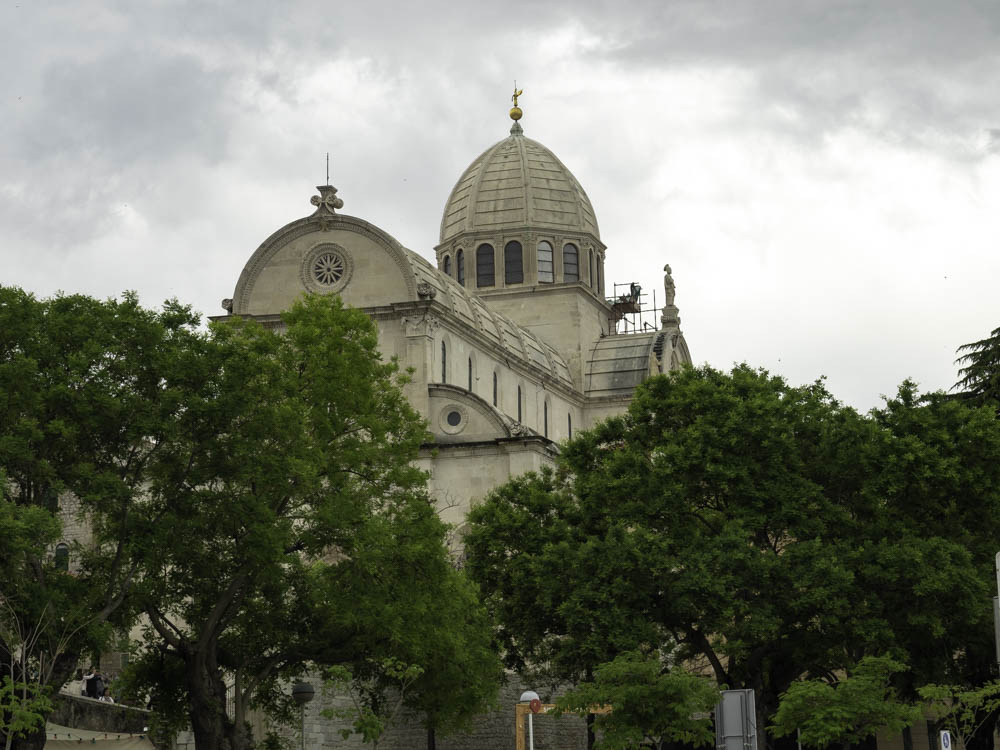 5月27号是旅途最辛苦的一天,早上出发前往希贝尼克(Sibenik)。希贝尼克是一个有近千年历史的小城,不同于亚德里亚海沿岸的其它城市是由希腊人、伊利里亚人和罗马人建立的,它是由克罗地亚人独立建立的城市。城中的圣雅各布(st.jacob)大教堂是联合国教科文组织世界遗产,它是融合了哥特式和文艺复兴式风格的建筑,其实它的名字应该是圣詹姆斯(st.james)大教堂, 只是在克罗地亚语中jacob 和 james 是同一名字。圣雅各布大教堂修建了105年(1431-1536年), 外墙有威尼斯共和国象征的石狮,教堂主要的建筑材料来自附近的采石场和世界上著名的克罗地亚Brac岛的白色石灰岩。据说这个教堂有着与其它教堂不同的特点: 其一,它是欧洲唯一一个只用石头建成的教堂,没有任何木制的部件或连接件,其实教堂内部柱梁之间有铁架支撑,不知是否为后来加固所为;其二,采用了一种非常超前的石板互连技术,而这种建筑技术在19世纪才开始应用,圣雅各布大教堂早了400年!其三,大教堂的外部形状与其内部形状完全对应,这也是独特的建筑结构;另外,教堂外部檐壁71个真人头大小的雕塑,用富有激情的现实主义手法刻画了渔民、农民、士兵、老人、孩童及普通市民,这在其它教堂也是少见的。但是参观时并不知这些细节,完全是景点照相的节奏。