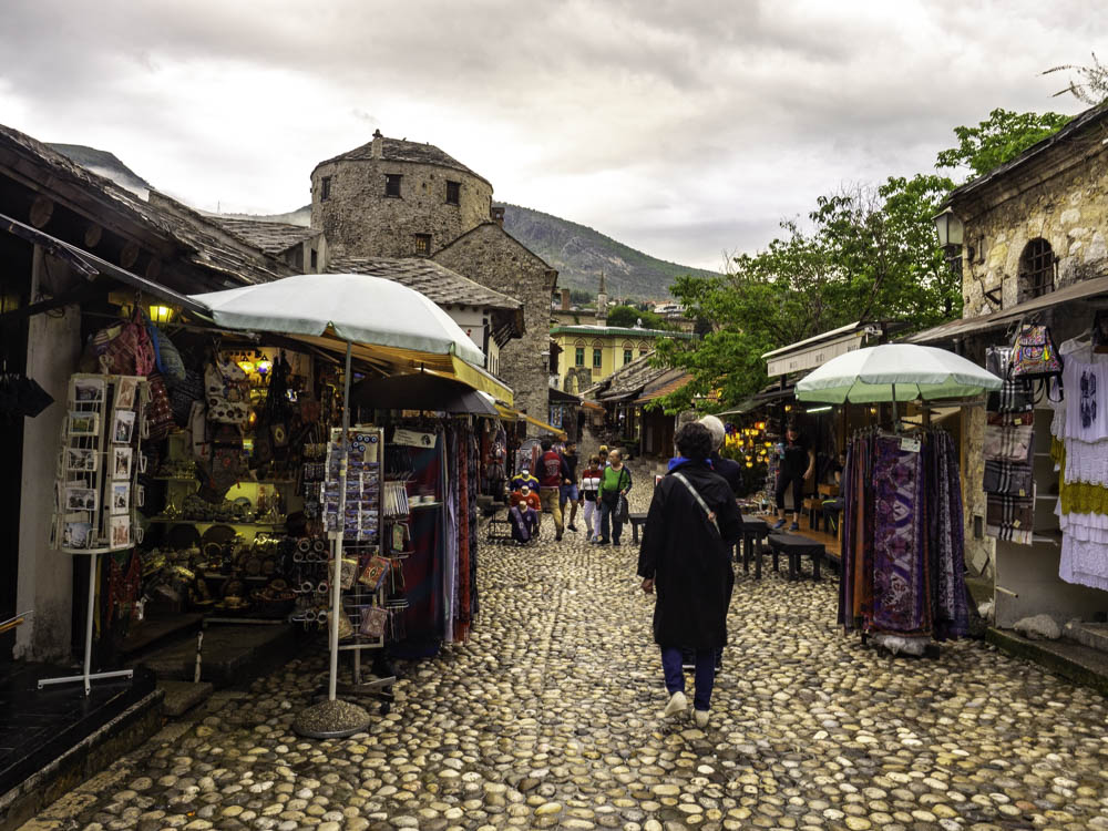 2:30pm出发去波黑的莫斯塔尔(Mostar), 我们沿河行驶在M17(E73) 路上,这不是高速公路,但车不多,路也还行,就是出入关(主要是入关)花了不少时间,到达莫斯塔尔已6:30pm, 由于下雨,天色已暗,直接去河滩,照了几张莫斯塔尔桥的照片就叫撤,城中比拳头还大的石头铺的小路,古朴典雅,与两边出售传统工艺品的小摊融为一体,走在上面如同足底按摩,临河边一家家餐馆时尚、小巧别致,如果在此享用一顿晚餐的浪漫风情,让你不敢相信20年前此地的血雨腥风。为了游览莫斯塔尔桥,做足了功课,可最后连桥都没来得及上!