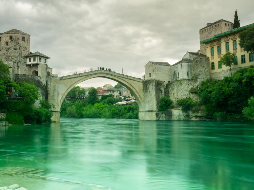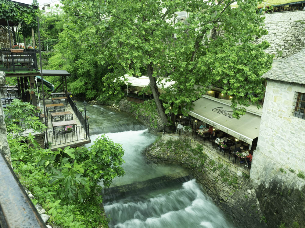 莫斯塔尔,意思就是古老的桥,城市以桥来命名,也以桥而闻名。这座横跨东西两岸的单孔石桥,始建于十六世纪奥斯曼土耳其统治时期,距今已经450年了,该桥只有4米宽, 30米长,24 米高。两岸建筑虽然风格相近,但也不尽相同,东边尖顶塔基本都是清真寺,西边高塔则为教堂钟楼,因为东岸多是波斯尼亚人,信奉伊斯兰教,西岸多是克罗地亚人,他们全是天主教徒,另外,还有少量的塞尔维亚人散居各处,他们是东正教徒,三族共处,三种宗教,这就是波黑的缩影。这条开通东西方贸易、连接东方的穆斯林和西方的基督教纽带的桥梁,四百多年中,两岸你来我往,和睦相处。没想到,这里却发生了二战后,在欧洲爆发的规模最大的一次局部战争,是最惨烈、最不可理喻的、同属斯拉夫人的一场内战。1992年,前南斯拉夫开始解体后,波黑的波斯尼亚、塞尔维亚和克罗地亚三个主要民族发生严重分歧,民族矛盾骤然升级,导致战争爆发。波黑人口不过四百万,那场战争使将近三十万人失去生命,二百万人无家可归,莫斯塔尔这座古桥也在那场战争中被炸毁,我们看到的这座桥是在停战后,在国际社会的帮助下,于2004年重建的,所用石料采用了沉入河中的部分原始石料,以及从当地取材补充,基本恢复了老桥的原始状况。