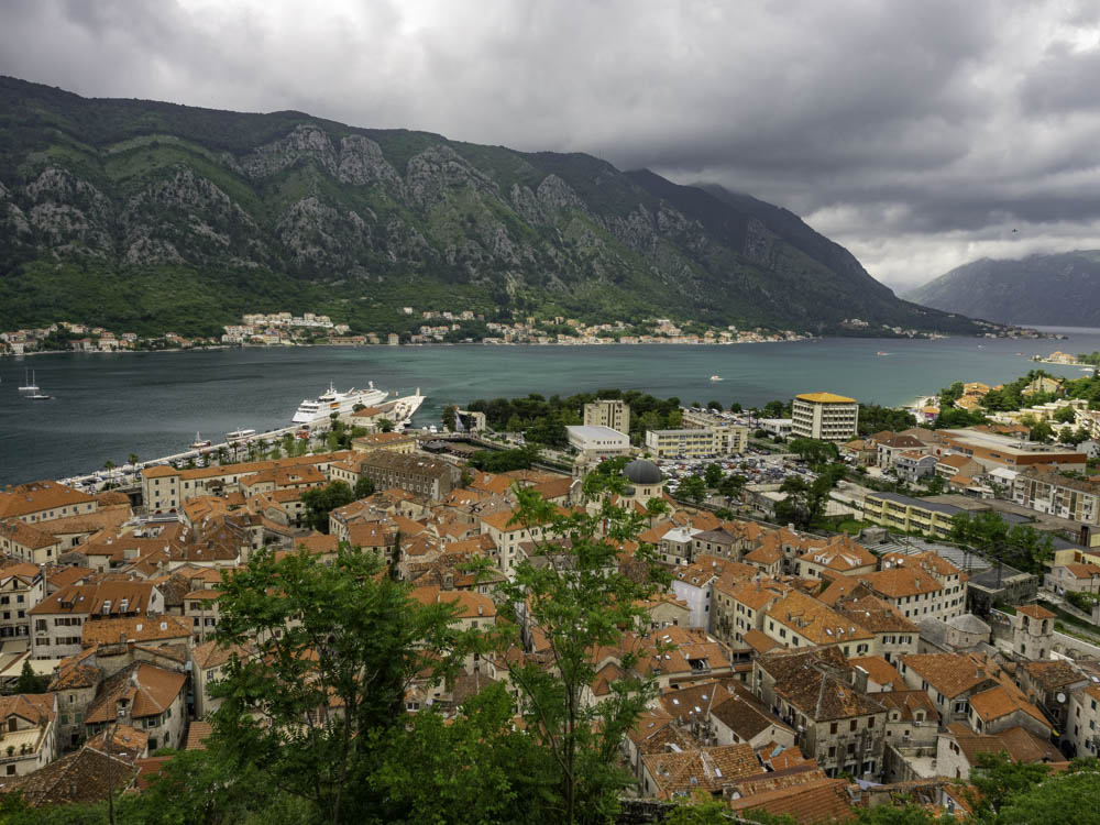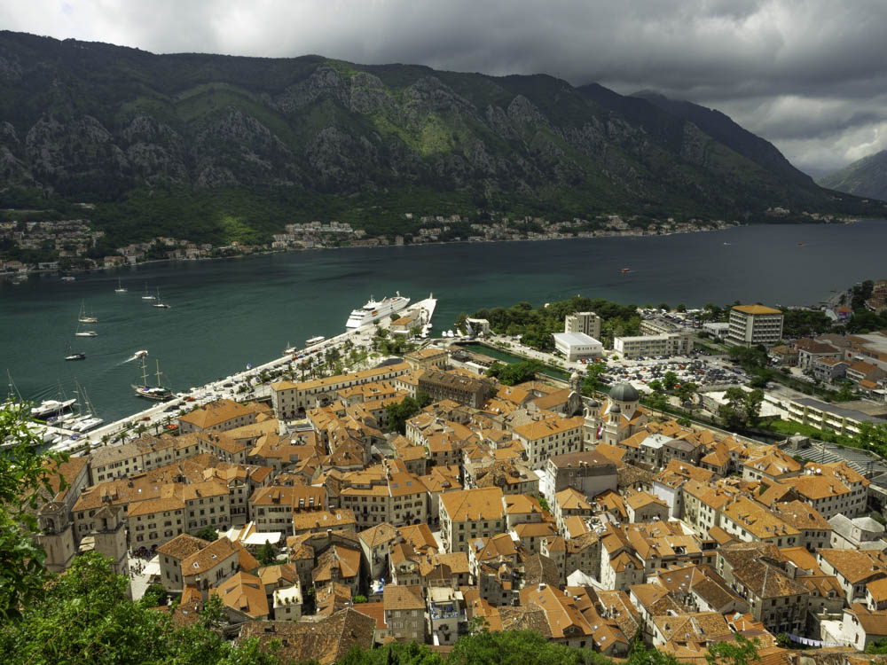 5月29日又是很长一天,经过了三个国家。第一站为黑山共和国(Montenegro)的古城科托尔(Kotor), 科托尔位于杜布罗夫尼克南边、亚得里亚海的一个蝴蝶结状的峡湾处,我还是第一次知道峡湾这个名词,峡谷被海水倒灌,并与大海相连,就成了峡湾。杜城离科托尔很近,但要沿着峡湾走大半个蝴蝶结,90公里开了2个小时,好像有渡轮,也许会省点时。早在公元前二世纪科托尔已经有先民居住,6世纪时东罗马帝国查士丁尼大帝在此开始建城。11世纪初为保加利亚第一帝国占领,后来又割让给塞尔维亚帝国。15世纪初被威尼斯共和国统治。18世纪末被并入奥地利哈布斯堡王朝。第二次世界大战后,科托尔属于南斯拉夫联盟的一部分,2006年,黑山共和国独立。由于该古城保护完好,在1979年被列入联合国教科文组织世界遗产。我们从主门海门进入,海门建于1555年威尼斯统治时期,融合了文艺复兴时期和巴洛克风格,由厚重的石砖和石柱所构成。在海门的门楣上,有一排南斯拉夫语: “Tu?e ne?emo, svoje ne damo” 是前南斯拉夫领导人铁托的名言,“是别人的我们不会拿,是我们的别人休想抢”,下方的“21-XI-1944”是科托尔在二战中脱离纳粹统治的日期。古城中有14个教堂和修道院,9个宫殿,还有10多个城市防御工程。这些建筑绝大部分建于15-18世纪,最早的建于12世纪。1979年4月15日黑山沿海地区发生大地震,一半老城区被毁。现在看到的有些建筑是经过修复的。
