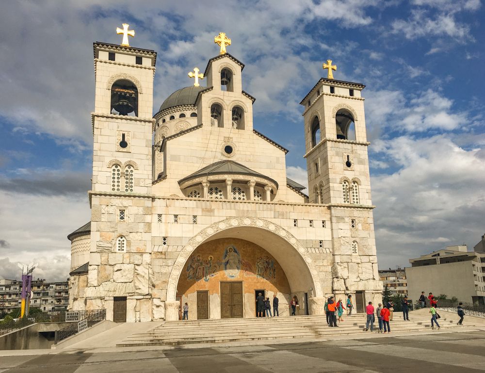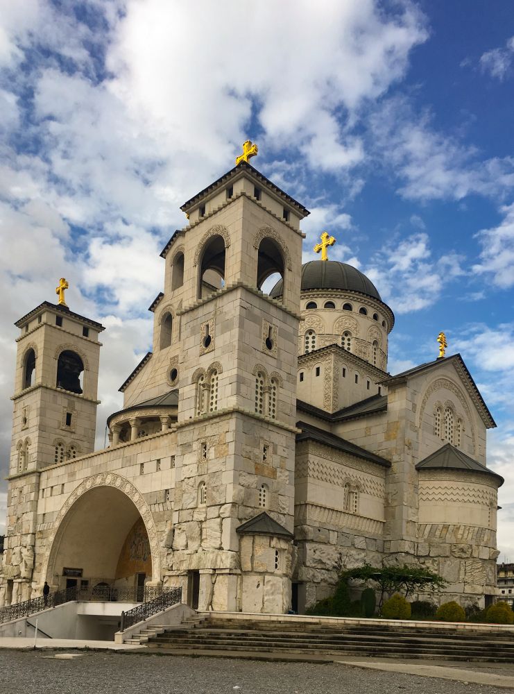 3点出发去黑山首都波德戈里察(Podgorica), M2.5公路是一条山路,远处山峰层峦叠嶂,近处或是碧蓝的大海,或是散落着红屋顶的小城,景色如画,在山上一处大美,司机还停车让大家照相,可惜有点雾,相机也不给力,要不然能出大片呢。5点到波德戈里察, 参观了一个刚建好的东正教大教堂(Saborni hram hristovog vaskresenja), 十字型教堂,中间圆穹顶,四周为半圆顶,彩绘绚丽夺目。
