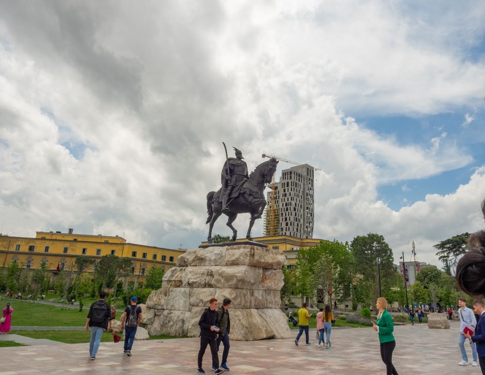 博物馆外面正面上方巨幅的马赛克镶嵌壁画,是广场最引人注目的地方,描述了从2000多年前伊利亚人时代到二战时,阿尔巴尼亚人为国家民族奋战的历史。博物馆外面的斯坎德培广场,镶以彩色石板,光亮照人,相当漂亮,广场因民族英雄斯坎德培(Skanderbeg)骑马的雕像而得名。斯坎德培在1440到1460年之间是抗击奥斯曼帝国入侵的民族英雄,他以弱抵强,智勇双全。被誉为阿尔巴尼亚的亚历山大大帝。他使用作为自己标志的黑色双头鹰,就成为自1912年独立后至今的阿尔巴尼亚国旗及国徽标志,代表“山鹰之国“的阿尔巴尼亚。