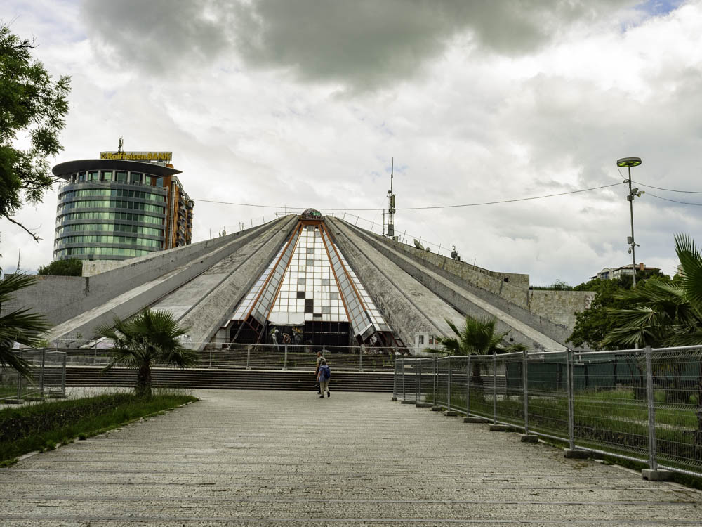 在去吃午饭途中,正好路过金字塔,这个锥体建筑并不高,但很大,占地近万平方米,它本来是由霍查作建筑师的女儿女婿设计的霍查纪念馆,于1988年落成,使用不到四年被关闭,现杂草丛生,外部被涂鸦,装饰玻璃和铁架也破损锈蚀,完全荒废了。门外坐着一老者,表情惆怅落寞,可能是在这里对霍查及那个远去时代的缅怀,往事已矣,可忆不可追。