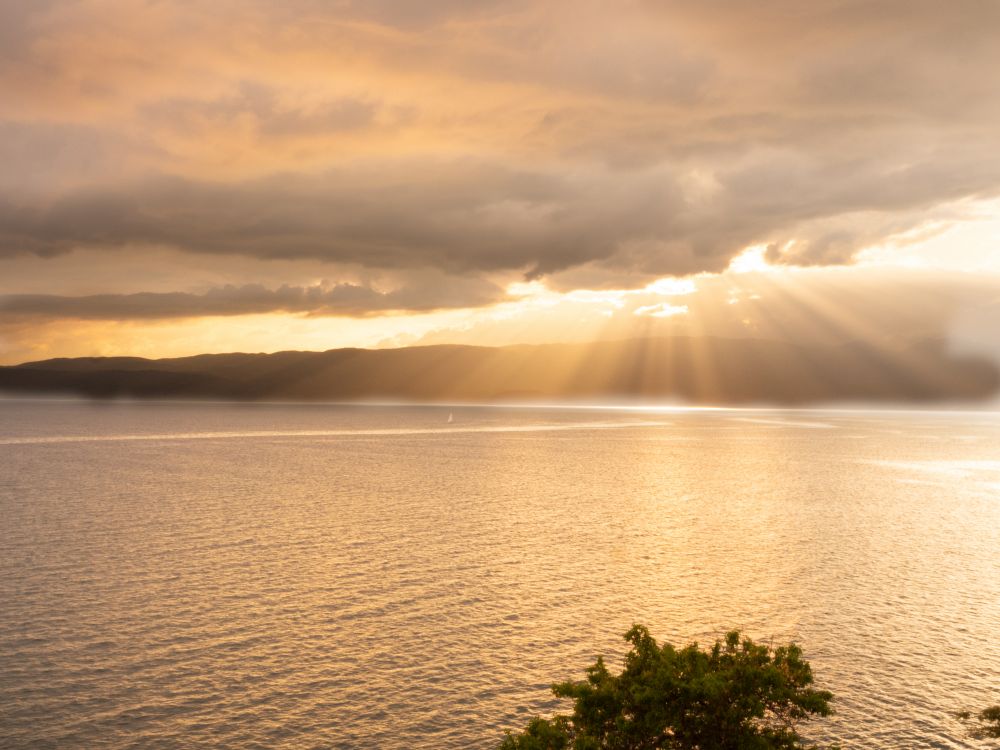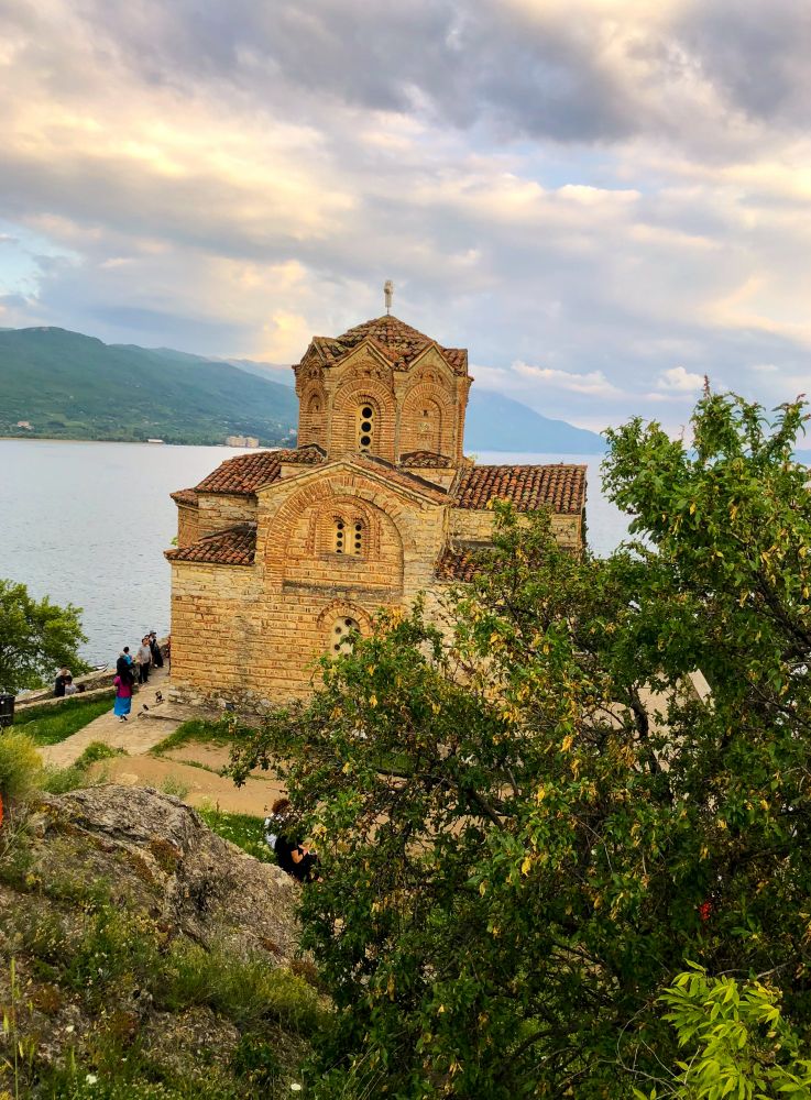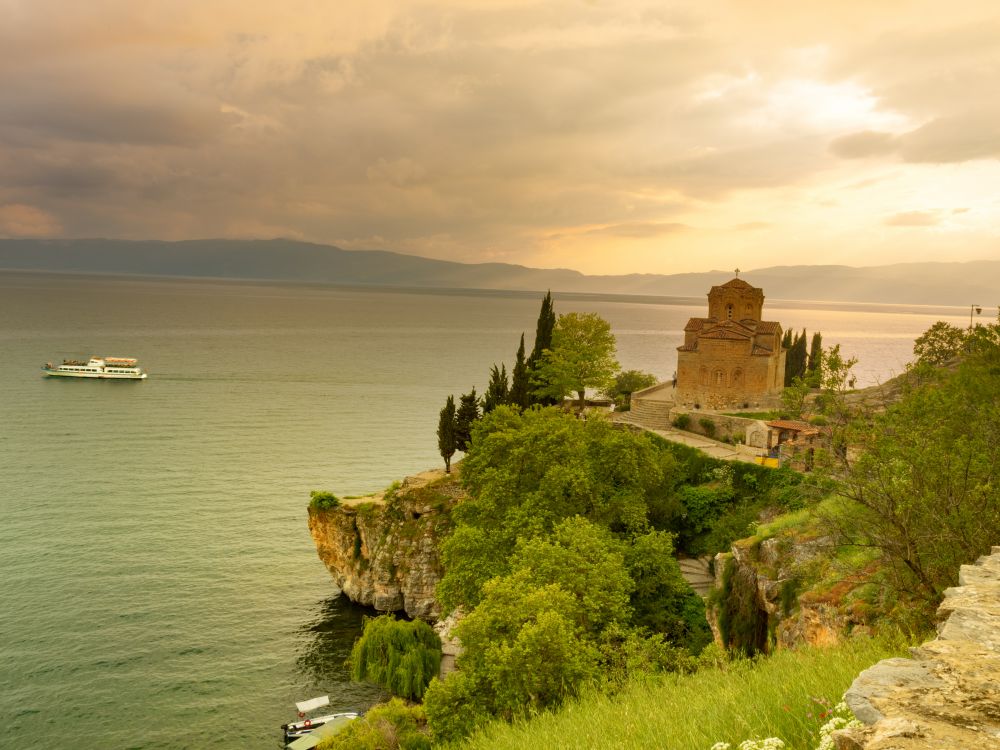 从地拉那开始向东去马其顿的奥赫里德(Ohrid), 奥赫里德是欧洲最古老的城市之一, 公元前353年第一次被希腊文献所记录,称为“阳光之城”, 因为一年之中有230天阳光明媚,在公元879年,更名为“奥赫里德”。现在的奥赫里德,主要是在公元7世纪至19世纪建造而成。在拜占廷时期,奥赫里德成为重要的经济、文化中心和东正教的主教中心。奥赫里德曾经一度拥有过365座教堂,每天可以去不同的教堂做礼拜,而得名“巴尔干的耶路撒冷”,但目前只有二十几座了。1/3在阿尔巴尼亚,2/3在马其顿境内的奥赫里德湖是巴尔干半岛第二大湖,奥赫里德湖湖水较深,最深处286米,水源主要来自地下水和山泉,它是欧洲少见的未受污染的淡水湖。我们首先随导游去建在奥赫里德湖边悬崖上的圣约翰教堂(Church of St.John), 教堂可能初建于13世纪,这是一个基座为正方形的十字型的建筑结构,从教堂带瓦屋顶可推断它受亚美尼亚教堂建筑风格影响。从这里可以远眺奥赫里德湖,正好是太阳下山,夕阳从云层中穿出,光芒直射湖面,如撒上一层金光。出来这些天一直多雨,多阴天,今天的湖边夕阳很给力。